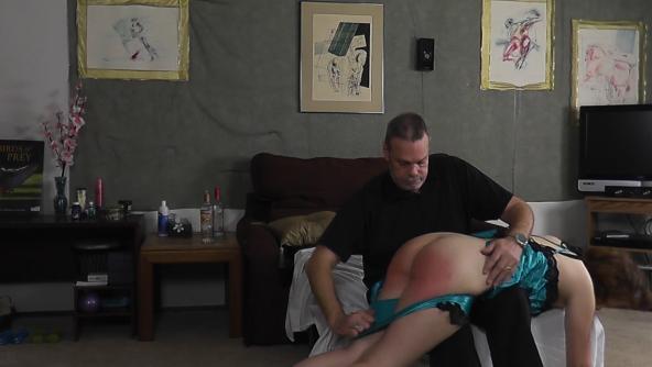 Little brat, Breana, with an already stinging butt, is pulled over her guardian's knee for more spankings. She pouts and complains, but to no avail, as he yanks down her silk pj shorts, baring her tight little ass. He begins spanking her very hard, and she kicks and writhes with the stinging smacks, but he is clearly very upset with her, and keeps up the pace. By the time he is done, her ass looks like its on fire, and she promises to do her chores and her college studies by the time he returns from his golf game. After rubbing her sore cheeks, she is dismissed to get dressed, pouting and sulking as she walks away...