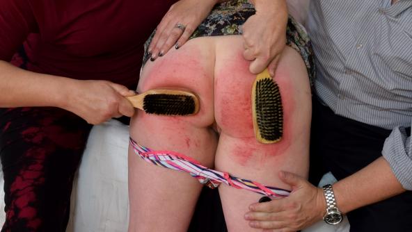 double hairbrush spanking, a welted bottom, Tina Dunston, double otk spanking, harsh belt strokes, a double caning, hard spankings, stinging belt swhipping, hot female/female spanking, Miss Chris, bare bottom discipline, cruel cane strokes