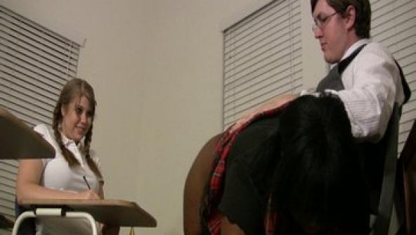 "Detention Delinquents" is the biggest new series to come out of Disiplinary Arts in Years. It features multiple girls attending detention in a girls school which has not gotten rid of corporal punishment as a last resort disciplinary measure. Detention Delinquents 1 features Nikki, Christy, Stevie and Kat as girls who just can't stay out of trouble. Before the end of detention, each and every one of them is given a very sound ruler spanking and a very hard and long over the knee bare bottom hand spanking, with each individual chapter focusing on a single girl, how she got in trouble, and her full spanking, before all four of them getting spanked together at the end of the day in part 5! In part 1, Detention begins as Mr. Johnson calls role and realizes Nikki is not wearing a proper uniform. After he gives her the mandatory 12 ruler strokes o0ver panties, she sits down and throws a pencap at him and calls him an asshole for spanking her over a uniform. Kyle has enough and takes her over his knee for a very long bare botto spanking as she kicks and struggles before sending her to the corner to sit in the dunce chair with the dunce cap on to make sure she remembers to behave in detention! Four young-looking girls, all playing off each other well and watching each others very hard spankings inside our BRAND NEW school classroom set!