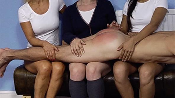 MP4 version: www.spankinglibrary.com/clipdetails.php?id=18416 The assistant PE teacher tried to have Susie and Rebecca remove their shorts during class, and the girls reported him to the teacher. After enduring a painful hand spanking, this tosser of a teacher still must face the cane. One by one, Miss Kendal and the girls give the poor louse six hard strokes each, lashing him over and over whilst he writhes in pain. The relentless punishment only gets harder, until his cheeks are covered in raw, stingy red lines. Finally, a hard handspanking right on top of his fresh red stripes reduces the young man to a quivering ball of agony. Part 2 of 2