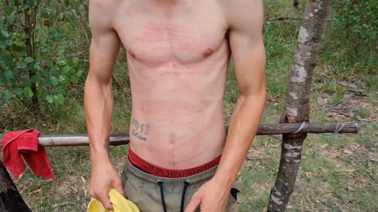 Pieter has been fooling around with the wrong girl and now has to pay for it. To make sure he knows he cannot think with his dick he has to spray his cock and balls with Deep Heat - In seconds this has him complaining and moaning. Then he gets some great strokes with the martinet on his belly and chest, but as he has been a bit cock happy he also gets the martinet laid on his junk, which doubles him up. A classic punishment clip.