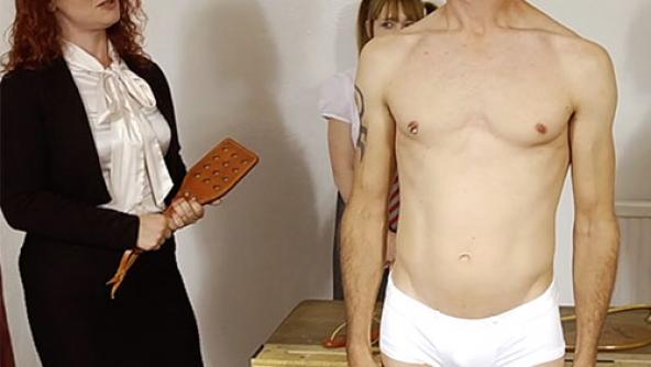 The girls are done shooting their scenes, and now it's time to have some fun with the cameraman! Bent over the girl's desk, the lucky lad presents his young bottom for Miss Kendal's hard hand, who smacks his cheeks repeatedly through his underpants. After Helen and Diana help to pull down his tighty whities, hard paddlings, sharp canings, and the young ladies' excited giggles all make a fun session for this strapping young man.