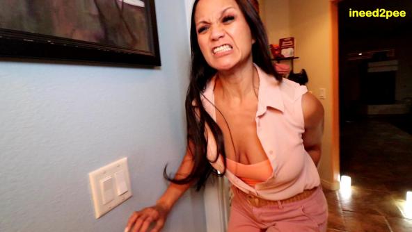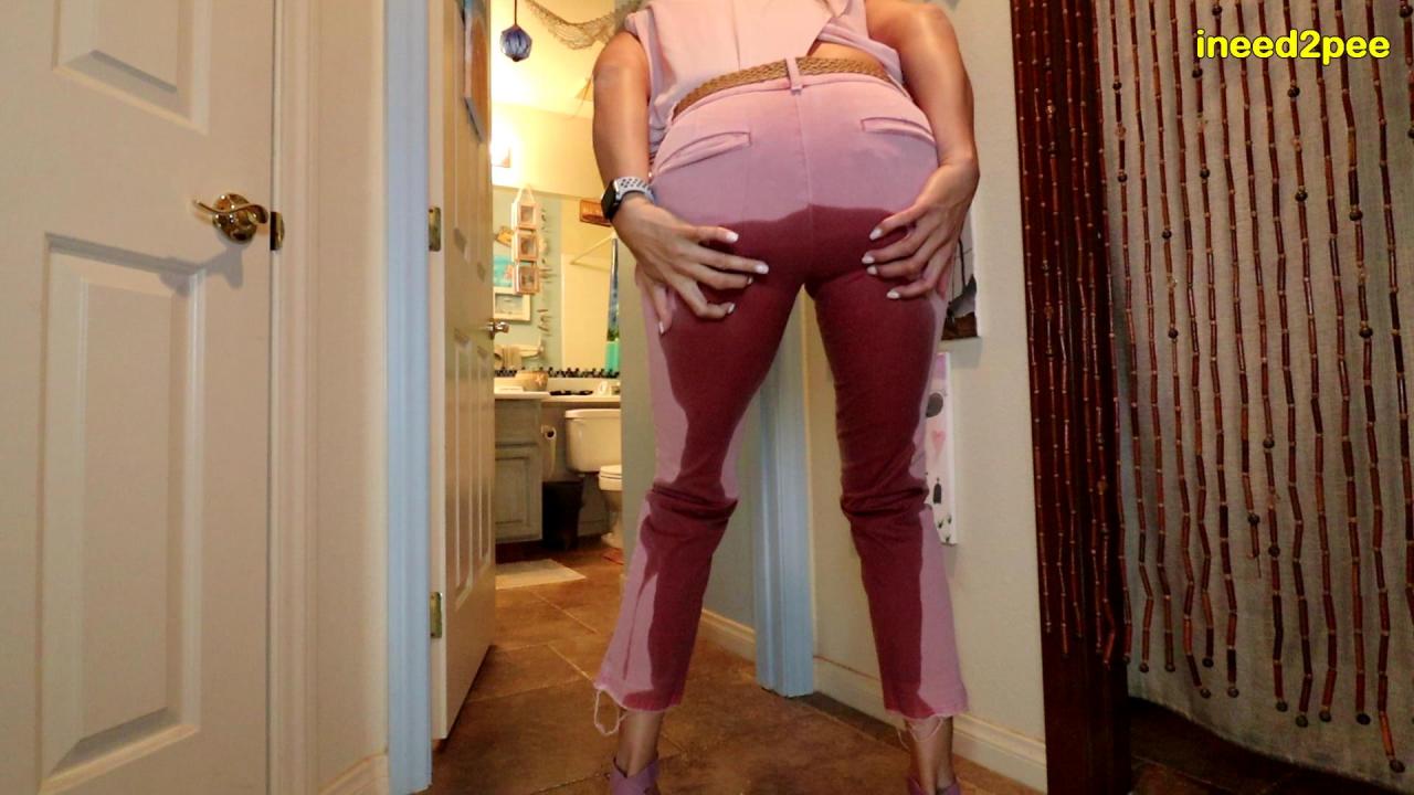 Jazmine Cruz cuts in front of me at a bathroom line. I'm like "excuse me, I also need the restroom!" but judging from her hands holding both ends, front and back, and her frantic pee pee dance, she admits she needs to go number 2 as well. "oh, those burritos!" she really needs to clench her butt tightly... There's just so much pressure. I tell her I can totally relate as we've all been there and let her go ahead of her. WIth a gasp, the look on her face changes & there's a small wet spot on her crotch! It starts spreading and when she turns around, it's revealed she's pissing her nice pink pants! Her pee is making very dark streaks going down both legs and dripping off the ends, wetting her nice platform sandals too. It's nice seeing the wet marks on the shoes. The lady comes out of the bathroom & Jazmine pushes past her, yelling that she's about to MESS herself. She comes out of the bathroom, talking about what a huge #2 she just had, all the farts that came out and now there's a skidmark on her panties! In the BTS, she shows off her peed pants & talks about one time when she thought she had to fart but more came out in her panties and we laugh about it.