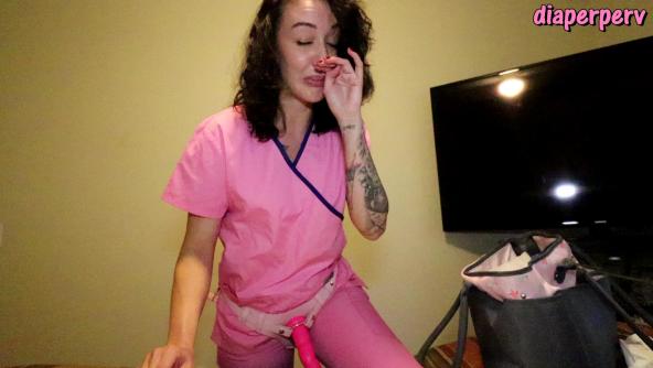 Your nurse comes in and needs to discuss some concerning news on your chart; you haven't messed in 3 days! She checks your diaper and it's very wet but she needs to get out your stinky mess however she can so she gets her latex gloves on & opens your diaper to check up your bum with your finger. She's very sweet but firm & matter of fact about this butt invasion; she needs to do what it takes! She takes your temp rectally and then decides to use the strapon which will loosen your mess and suck it all out hopefully! She pegs you ass quickly and then tapes your diaper back on quickly. She presses on your tummy and can feel it starting to gurgle. You can't hold it in the back & push it all in your wet diaper; great success! Lee is pleased and uses and vibrator to make you cum for the trifecta. Right after you cum, Lee gets paged for an emergency so she puts plastic pants over your gross diaper & promises to be back to change you later... sorry!! LOL