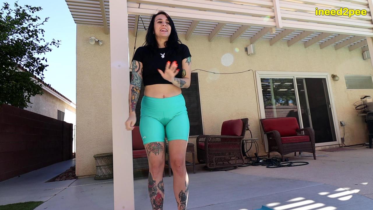 What a dilemma Mia Hope is dealing with. Being a new yoga instructor, she doesn't want to be late but doesn't want to leave in the middle to use the bathroom so she tries to hold it. So many compromising positions she must pose in, and she can't even grab her crotch to contain all that pee. She tries her best but her face is betraying her pee desperation. Once in a wide legged position and bending over, she can't hold it & some leaks out... oh dear... most pee is trickling out & soon she's helplessly pissing her tight spandex shorts! It's splashing down onto her yoga mat and she sighs in relief and humiliation. Afterwards she shows off her wet pissy shorts and pulls them down for you! Excellent & very hot desperation.