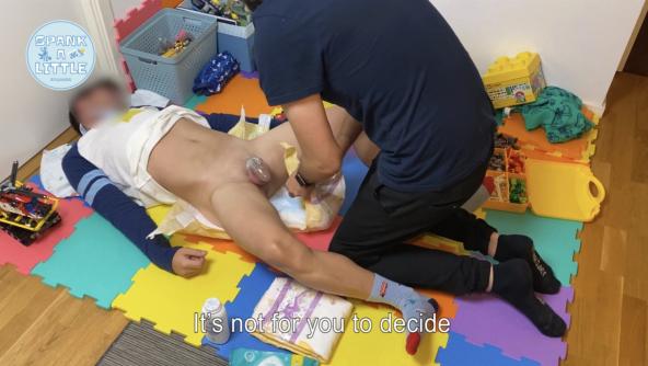 Buster is playing with his Lego when daddy comes and wants to do a diaper check. The diaper is soaked so daddy gets a fresh one. Buster is resistant during the change and gets a few smacks on his bottom and time out. The second attempt ends up with a spanking until Buster promises to be still during the change.