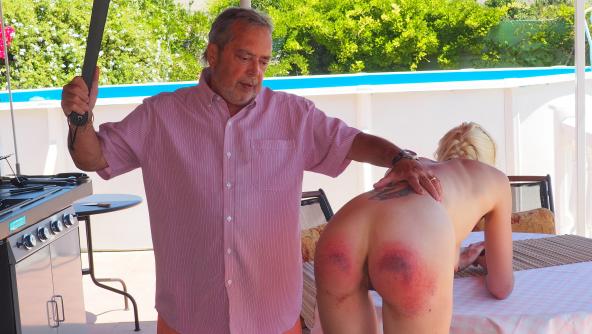 Meg came out to Spain to help Mr. Stern with his Spankers Cook Book. He is trying to put together some simple recipes he thinks may appeal to his members. It turned out that Meg was not quite as good at the BBQ as she said she was and most of the meat ended up inside Mr. Stern’s dog. He was not best pleased and gave her a real blistering with his long handled leather paddle. This really does sting as the colour of Megs bottom will prove