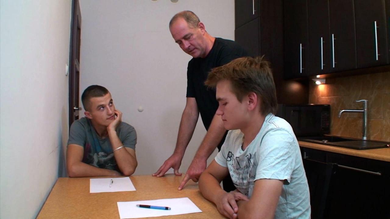 After Tony sets an English test fr the two lads and leaves the room Kel decides it is all to boring and goes rummaging around...he finds a couple of bottles of beer in the fridge and the two lads settle down to a chat ...They are just relaxing nicely when Tony returns and catches them, he is furious and he administers a good spanking to each in the wheelbarrow position, look as the ass on Kris, this guy has the most perfect butt ever ( and a massive cock as well ) Kel has a small firm butt that is so tempting to spank that I for one am glad he is a naughty guy...Two very hot lads in a great spanking position ....