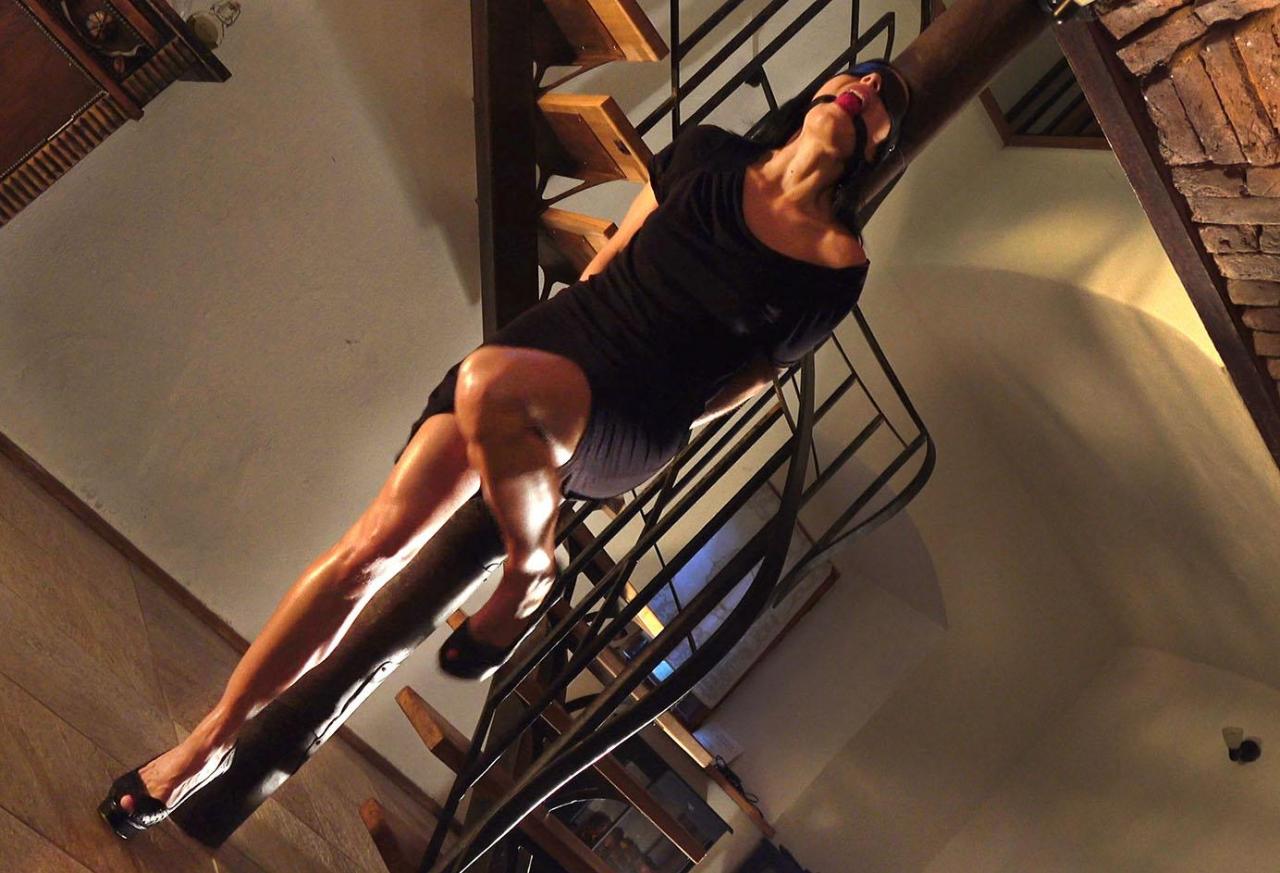 Alex wears a black mini dress and high heels. She is hand cuffed and ballgagged. Her dominator orders her to take her panties of. Since she refuses he whips her muscular long legs and bottom until she submits herself to his will and puts her underwear down. Later she gets helplessly captive with her arms over her head. Her dominator tears the front side of her dress and uncovers her firm breasts. Her tits get oiled and harshly bull whipped.