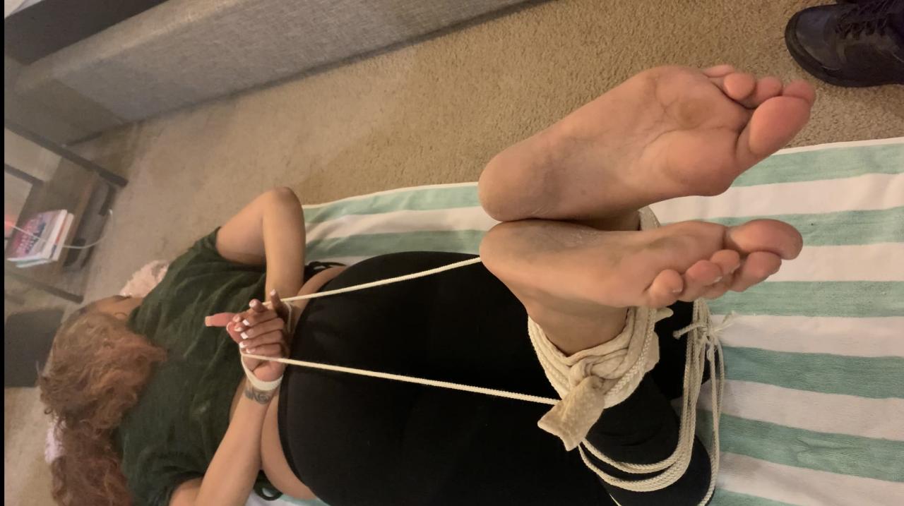 My slave Ashley has learned the preferences of her master quicker then other submissives and thus has been rewarded with more opportunities to please her master. In this clip Ashley explains at the beginning that she wanted to remember to wear proper shoes so that she would not be further punished. Her hands are tied behind her back and connected to her bound ankles creating a unique hog tie look. Her size 8.5 feet are flogged, first with her socks on and then on her bare soles. After a few minutes we switch to the thin whip where she’s beaten and her soles are shown in a few different angles. Ashley does a great job keeping her feet in position for the Bastinado punishment. She thanks her master for allowing her feet to please him as her punishment continues. You get close up views of the final strokes to her whipped soles at the end of the clip for a fantastic finish