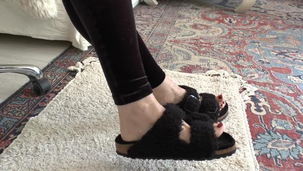 lady victoria valente, dark red toe nails, fur slippers, black slippers, flat shoes, black sandals, sexy soles, sexy toes, mature feet, sexy feet