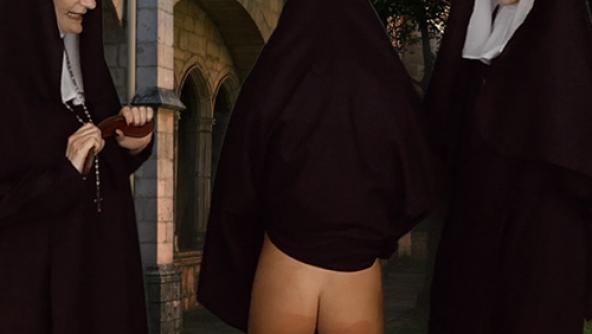 Novice sisters Ariel and Rebecca have confessed to sinful thoughts, and must undergo a cleansing ritual. Head nun Miss Mathews holds a heavy leather strap, instructing the pair to turn around and lift their robes. In the middle of the garden, Moth. Mathews spanks the girls repeatedly, stinging their tender bottoms with over and over with loud echoing slaps. Part 1 of 5