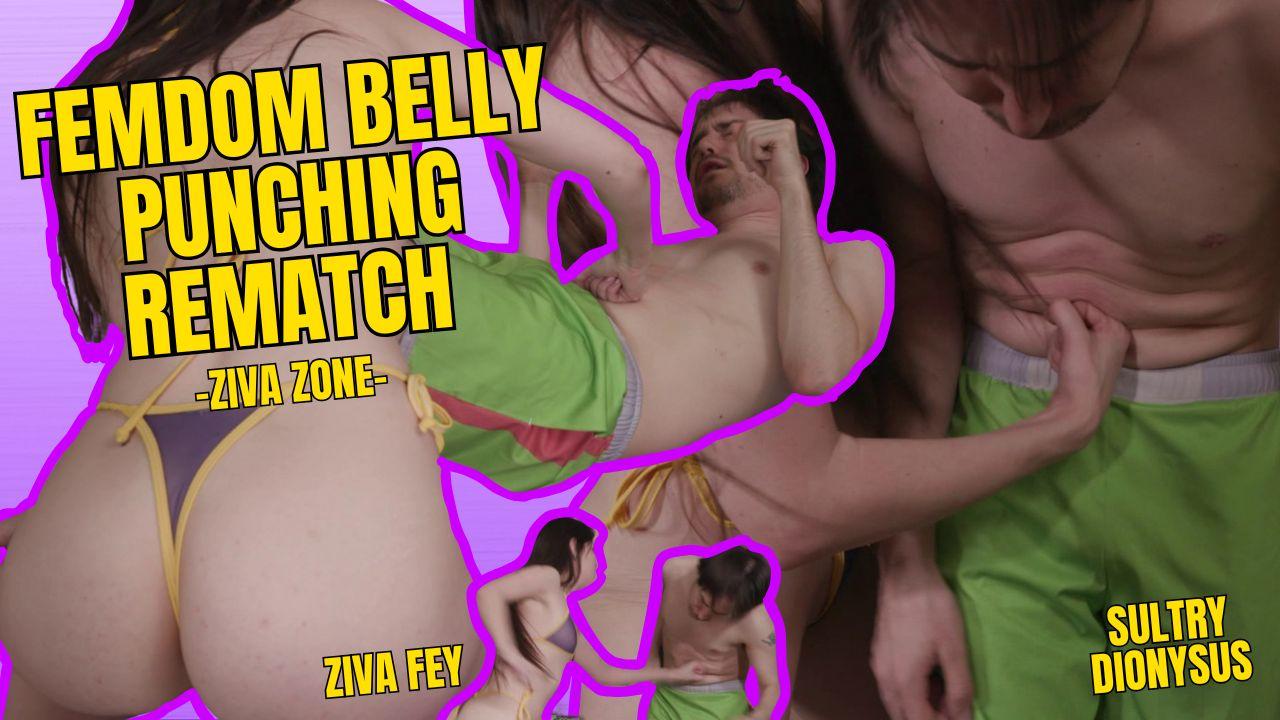 HD/ Sultry Dionysus has been training very hard and he has asked for a belly punching rematch in order to redeem himself against Ziva. The two of them square up and he desperately tries to punch Ziva throughout the video. However, she is too toned and strong with her black belt capabilities, and her core cannot be broken. Ziva dominates Sultry continuously punching him and throwing him around the ring as he grunts and groans in pain, being blown back by her fierce and powerful punches. His tiny weak belly gets pinker and pinker from the punches. Ziva uses his belly button as a perfect target to punch his belly raw, dominating him in the ring. Ziva runs and pats his belly to tease him that the pain is over, punching him more and more. Ziva repeatedly stomps on his belly and head scissors Sultry. Fully dominating him in every way. Showing that the petite spunky Goddess is truly more superior and tougher in every way!