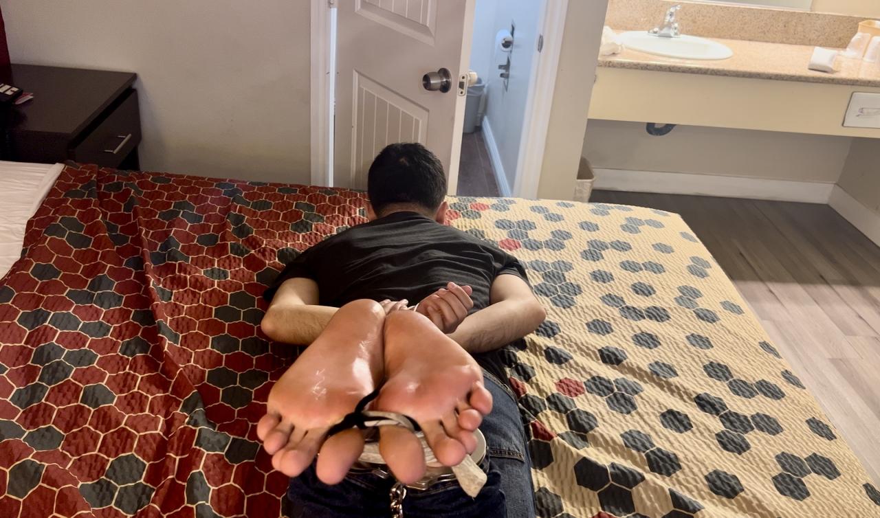 With his size 9 soles already tender and beaten from the whipping they received about an hour before this, Bastinado Lover now faces additional punishment and challenges from Master Fetish Legend. His two big toes and ankles already bound, Bastinado Lover begins to receive lashes of the thin whip as the second half of the session gets underway. He’s not given any warm up, instead seeing his soles whipped severely for the first minute and a half, before Master decides to handcuff him for the remainder of the session. The punishment only gets worse, as his naked helpless size 9 soles are beaten over and over, while he sometimes lets out moans that do him no good. For over 5 minutes, Maser Fetish Legend has his way with this slaves soles, until he gives Bastinado Lover a short break in between sets, taking time to oil his soles up to make them even more sensitive for more punishment. The thin whip continues to deliver severe lashes across his now oiled soles, giving this masochist all he can handle during this set of lashes which lasts 5 minutes. Master Fetish Legend then gives this slaves soles a taste of the bullwhip, which delivers a powerful sting each time it lashes across a pair of helpless bound soles. The next 5 minutes shows him have trouble keeping his beaten tender soles in position as they are destroyed with strokes of the bullwhip that echo across the entire room. The shackles make a jingle sound each time his naked soles are punished, and after about 3 and a half minutes his slave soles begin to shake due to the Bastinado punishment they have taken. Master tells his slave that he’s almost taken enough of a whipping, but that instead he has one more surprise for Bastinado Lover. It’s the blue punishment whip that delivers a merciless sting and can be delivered at such a high pace. He severely whips his slaves oiled soles to the point the oil is hardly visible anymore after these last few minutes of his session. After satisfying his sadistic craving, Master Fetish Legend finishes all over this slaves worn out soles to end the clip.