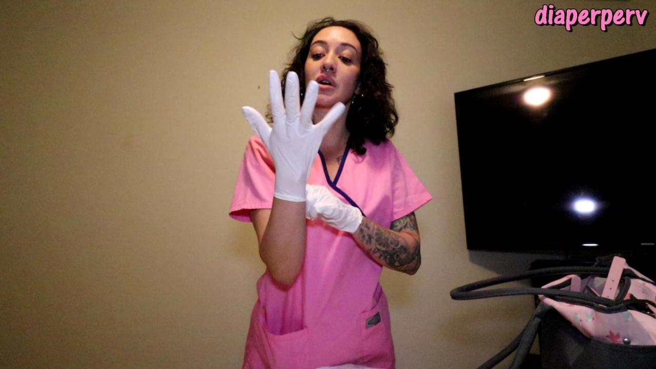 Your nurse comes in and needs to discuss some concerning news on your chart; you haven't messed in 3 days! She checks your diaper and it's very wet but she needs to get out your stinky mess however she can so she gets her latex gloves on & opens your diaper to check up your bum with your finger. She's very sweet but firm & matter of fact about this butt invasion; she needs to do what it takes! She takes your temp rectally and then decides to use the strapon which will loosen your mess and suck it all out hopefully! She pegs you ass quickly and then tapes your diaper back on quickly. She presses on your tummy and can feel it starting to gurgle. You can't hold it in the back & push it all in your wet diaper; great success! Lee is pleased and uses and vibrator to make you cum for the trifecta. Right after you cum, Lee gets paged for an emergency so she puts plastic pants over your gross diaper & promises to be back to change you later... sorry!! LOL